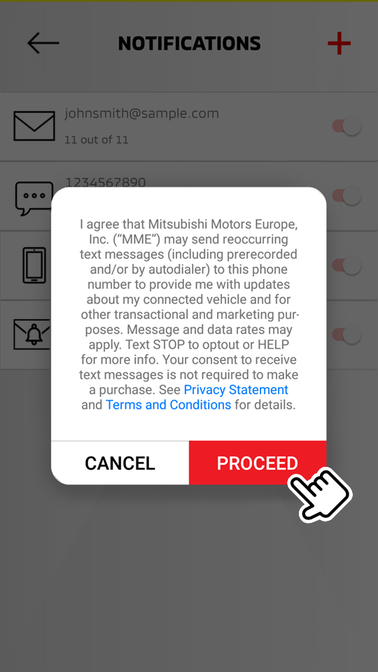 NoteWhen the switch is toggled to enable the marketing notifications, the pop-up message below is displayed.   Select "PROCEED" to continue setup.