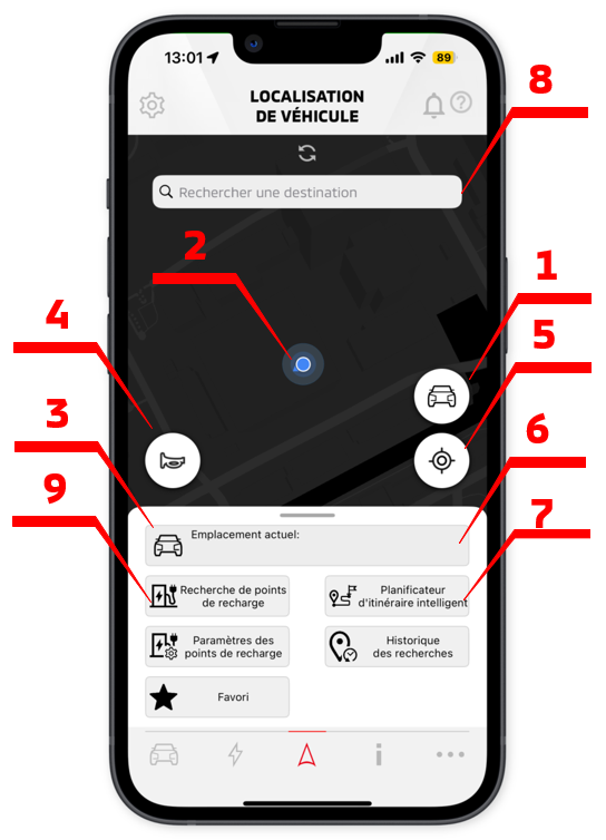 Icône du véhicule : Un marqueur indique la position actuelle du véhicule dans un rayon d'un kilomètre autour de l'emplacement du téléphone intelligent du propriétaire.