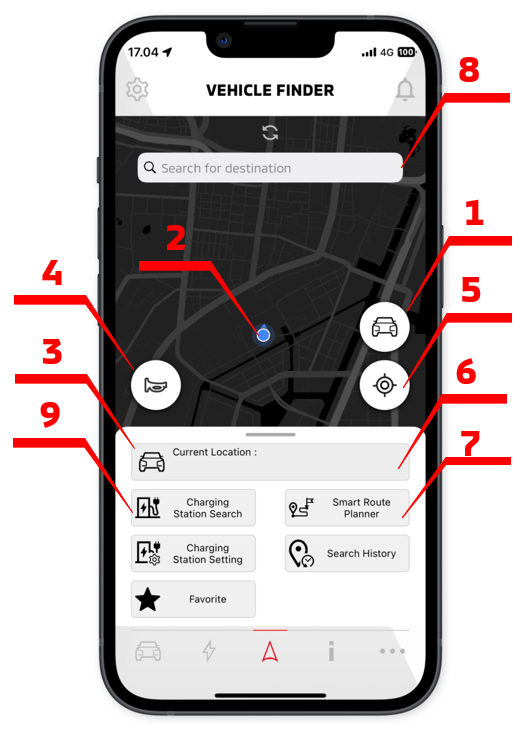 Vehicle Icon: A vehicle marker indicates the current location of your vehicle within a one-mile radius of the owner's smartphone location.